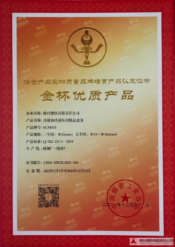 冷鐓和冷擠壓用精品盤(pán)條SCM435φ23mm;φ14-φ16mm規(guī)格獲冶金產(chǎn)品實(shí)物質(zhì)量金杯優(yōu)質(zhì)產(chǎn)品認(rèn)定證書(shū)