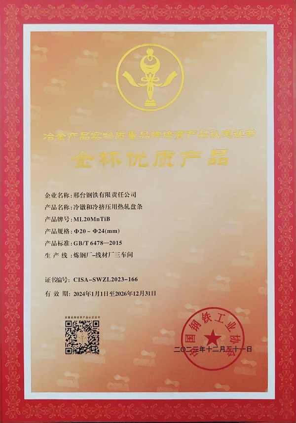 冷鐓和冷擠壓用熱軋盤(pán)條ML20MnTiBφ20-φ24mm規(guī)格獲冶金產(chǎn)品實(shí)物質(zhì)量金杯優(yōu)質(zhì)產(chǎn)品認(rèn)定證書(shū)