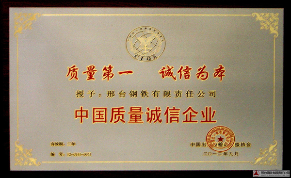 2012年9月,邢鋼被中國(guó)出入境檢驗(yàn)檢疫協(xié)會(huì)評(píng)為“中國(guó)質(zhì)量誠(chéng)信企業(yè)”,并頒發(fā)獎(jiǎng)牌。