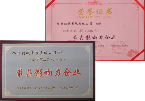 2008年6月,邢鋼榮獲由河北省國資委、河北省中小企業(yè)局、河北省企業(yè)聯(lián)合會頒發(fā)的“河北省第二屆最具影響力企業(yè)”榮譽(yù)稱號。