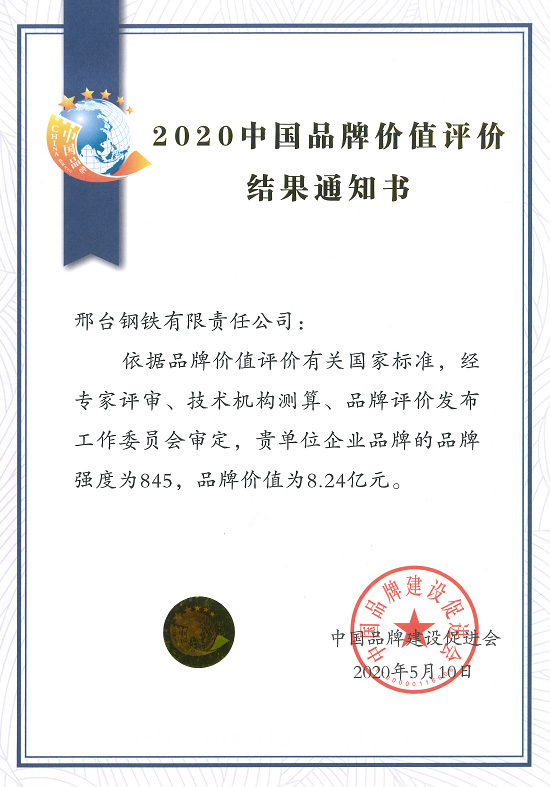 2020年5月10日“中國品牌日”,由中國品牌建設促進會聯合中國資產評估協會等單位在新華網演播廳舉行“2020中國品牌價值評價信息發(fā)布”線上活動的評定結果。邢鋼榮登價值品牌榜第七組冶金有色組,這也是邢鋼首次登上該品牌價值榜。