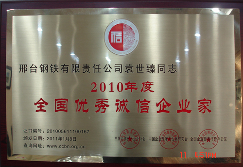- 日前,在由中國(guó)合作貿(mào)易企業(yè)協(xié)會(huì)、中國(guó)企業(yè)改革與發(fā)展研究會(huì)、全國(guó)企業(yè)信用評(píng)價(jià)辦公室組織召開(kāi)的中國(guó)企業(yè)科學(xué)發(fā)展論壇暨誠(chéng)信表彰大會(huì)上,邢鋼被評(píng)為2010年度“中國(guó)AAA級(jí)信用企業(yè)”、公司榮獲“全國(guó)文明誠(chéng)信示范單位” 稱(chēng)號(hào)、董事長(zhǎng)、總經(jīng)理袁世臻榮獲“全國(guó)優(yōu)秀誠(chéng)信企業(yè)家” 稱(chēng)號(hào)。