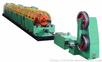 卷線:將鋼絲線盤,重新卷在捻股機(jī)的工字輪上;也可將鋼絲從拔絲機(jī)后直接卷到工字輪上;捻股:將鋼絲捻成繩股。捻股機(jī)有筐籃式、軸管式、無管式和雙捻機(jī)等。圖3為12軸管式捻股機(jī)示意圖,1是裝下層繩股的工字輪,2是旋轉(zhuǎn)的機(jī)筒,內(nèi)裝12個(gè)卷滿鋼絲的工字輪,3是成股的壓線瓦,4是牽引輪,5是上層繩股的收線輪,機(jī)筒旋轉(zhuǎn)一周,牽引輪引出的繩股長(zhǎng)度即為股的捻距。
