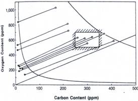 蒂森認(rèn)為的RH脫碳前的最佳鋼水成分,如上圖中“方塊”區(qū)域所示, RH脫碳前鋼水成分范圍控制在方框內(nèi)時,鋼水脫碳處理后[C]、[O]均較低,將減少脫氧用鋁量,有利于提高鋼的純凈度。