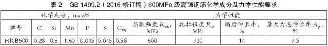 目前國(guó)內(nèi)有沙鋼、承鋼和濟(jì)鋼等鋼廠具備成功生產(chǎn)600MPa級(jí)熱軋螺紋鋼筋的經(jīng)驗(yàn)。表2為GB l499.2(2016修訂稿)對(duì)600MPa級(jí)高強(qiáng)鋼筋HRB600化學(xué)成分和力學(xué)性能的要求。