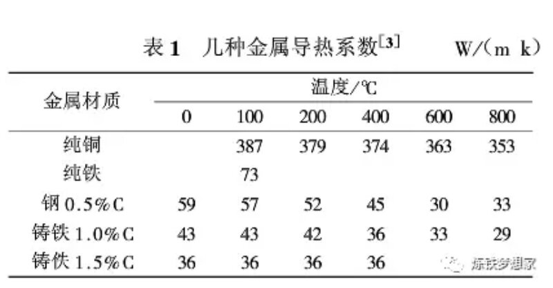 2000年以來銅冷卻壁以其良好的導(dǎo)熱能力和形成渣皮能力在我國(guó)高爐上得到廣泛的使用,目前全國(guó)約200座以上的高爐采用銅冷卻壁,尤其是在爐腹、爐腰和爐身下部等熱負(fù)荷較高的區(qū)域。高爐冷卻壁主要包括鑄鐵和純銅,另外還出現(xiàn)過鑄鋼冷卻壁。鑄鐵冷卻壁抗熱震性能差、導(dǎo)熱系數(shù)低。另外,其冷卻水管是鑄入鑄鐵本體內(nèi)的,由于材質(zhì)和膨脹系數(shù)的不同,形成氣隙層,而影響了傳熱。這些缺陷限制了鑄鐵冷卻壁的進(jìn)一步發(fā)展。因此,從上世紀(jì)70年代歐洲開發(fā)和使用了銅冷卻壁,得到較好的效果。表1為幾種不同金屬導(dǎo)熱系數(shù),可以看出純銅的導(dǎo)熱系數(shù)遠(yuǎn)優(yōu)于其他材料。