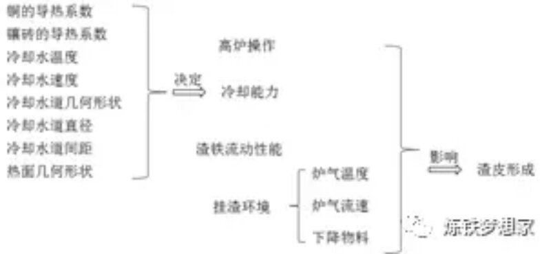 對(duì)于爐腹、爐腰及爐身下部等高熱負(fù)荷區(qū)域,無(wú)論是鑄鐵冷卻壁還是銅冷卻壁,渣皮的保護(hù)作用對(duì)冷卻系統(tǒng)的長(zhǎng)壽至關(guān)重要。冷卻壁熱面存在穩(wěn)定渣皮時(shí),塊狀帶物料、熔融渣鐵及高溫煤氣等不能直接接觸冷卻壁壁體,從而減少磨損、渣鐵侵蝕、“氫病”及有害元素等問題的發(fā)生,大幅提高冷卻壁壽命。渣皮的形成過程受多方面因素影響,如圖1所示。