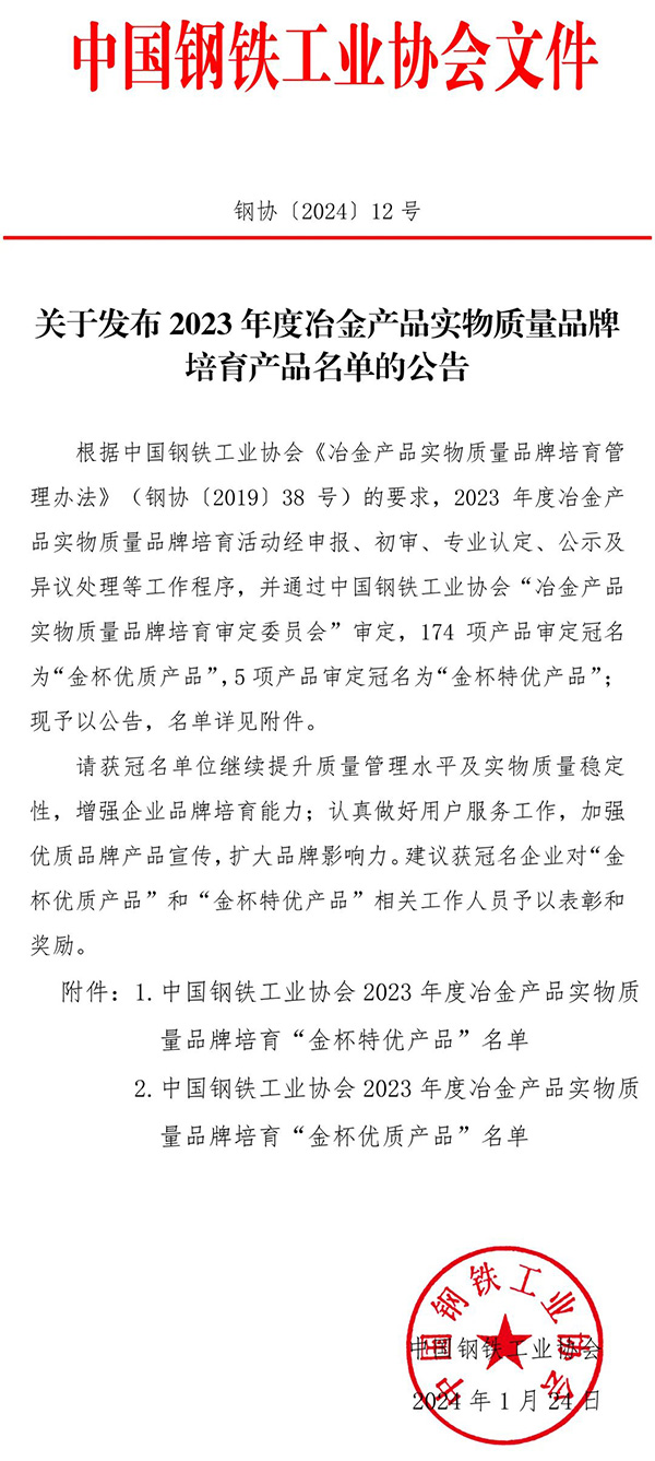 2024年1月24日,中國鋼鐵工業(yè)協(xié)會發(fā)布2023年度冶金產(chǎn)品實物質(zhì)量品牌培育產(chǎn)品名單公告,邢臺鋼鐵申報的《冷鐓和冷擠壓用熱軋盤條ML08Al》和《冷鐓和冷擠壓用熱軋盤條ML20MnTiB》獲冶金產(chǎn)品實物質(zhì)量品牌培育“金杯優(yōu)質(zhì)產(chǎn)品”。 至此,在合金冷墩鋼、簾線鋼、軸承鋼、焊接用鋼、預應力、易切削鋼、耐候鋼種等應用領域,邢鋼共有近50個產(chǎn)品獲此殊榮,這標志著公司高端鋼種產(chǎn)品實物質(zhì)量達到了國際同類產(chǎn)品實物水平。
