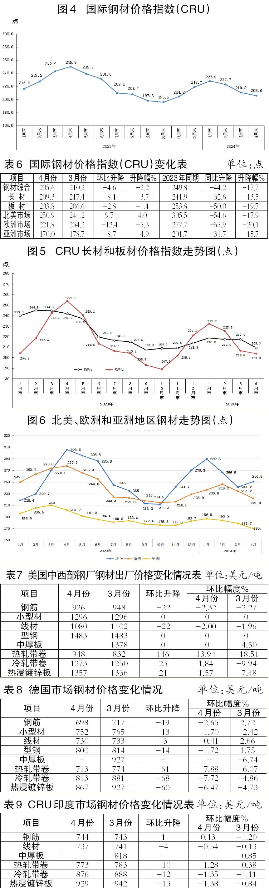 1月—4月份,CRU國(guó)際鋼材價(jià)格指數(shù)平均值為216.6點(diǎn),同比下降17.4點(diǎn),降幅為7.4%。