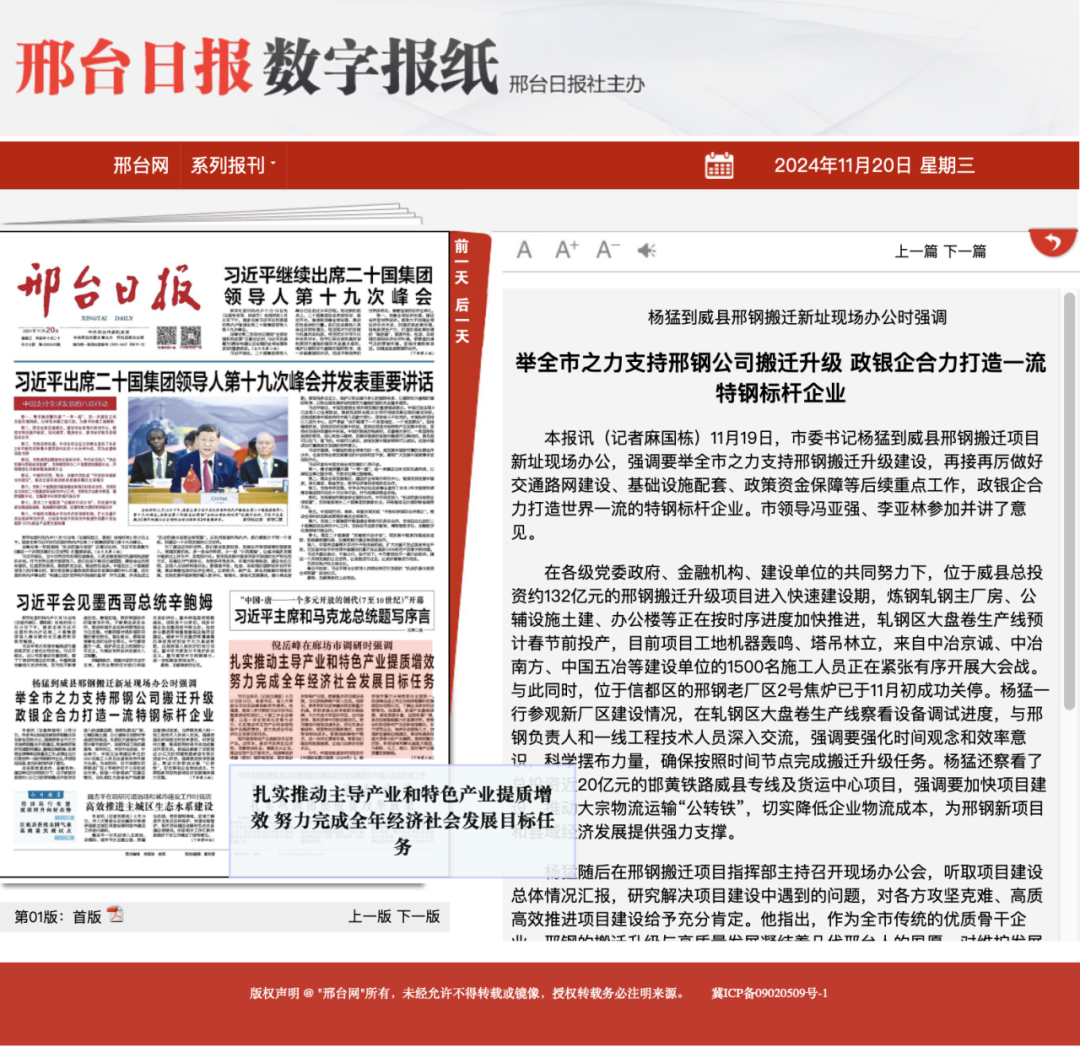 在各級黨委政府、金融機(jī)構(gòu)、建設(shè)單位的共同努力下,位于威縣總投資約132億元的邢鋼搬遷升級項目進(jìn)入快速建設(shè)期,煉鋼軋鋼主廠房、公輔設(shè)施土建、辦公樓等正在按時序進(jìn)度加快推進(jìn),軋鋼區(qū)大盤卷生產(chǎn)線預(yù)計春節(jié)前投產(chǎn),目前項目工地機(jī)器轟鳴、塔吊林立,來自中冶京誠、中冶南方、中國五冶等建設(shè)單位的1500名施工人員正在緊張有序開展大會戰(zhàn)。與此同時,位于信都區(qū)的邢鋼老廠區(qū)2號焦?fàn)t已于11月初成功關(guān)停。楊猛一行參觀新廠區(qū)建設(shè)情況,在軋鋼區(qū)大盤卷生產(chǎn)線察看設(shè)備調(diào)試進(jìn)度,與邢鋼負(fù)責(zé)人和一線工程技術(shù)人員深入交流,強(qiáng)調(diào)要強(qiáng)化時間觀念和效率意識,科學(xué)擺布力量,確保按照時間節(jié)點完成搬遷升級任務(wù)。楊猛還察看了總投資近20億元的邯黃鐵路威縣專線及貨運(yùn)中心項目,強(qiáng)調(diào)要加快項目建設(shè),推動大宗物流運(yùn)輸“公轉(zhuǎn)鐵”,切實降低企業(yè)物流成本,為邢鋼新項目和縣域經(jīng)濟(jì)發(fā)展提供強(qiáng)力支撐。