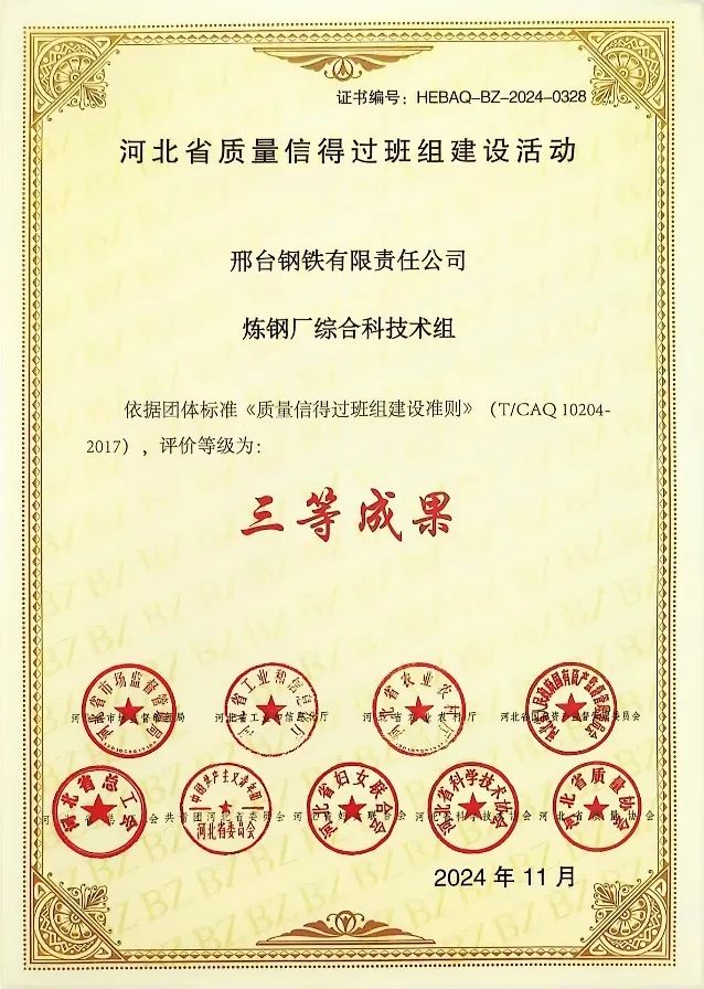 技術(shù)組成員以嚴謹?shù)膽B(tài)度、高度的責任感為公司產(chǎn)量質(zhì)量發(fā)展做出積極貢獻,在河北省質(zhì)量協(xié)會等部門組織的質(zhì)量信得過班組建設(shè)活動評比中,煉鋼廠綜合科技術(shù)組獲評河北省質(zhì)量信得過班組建設(shè)活動三等成果。