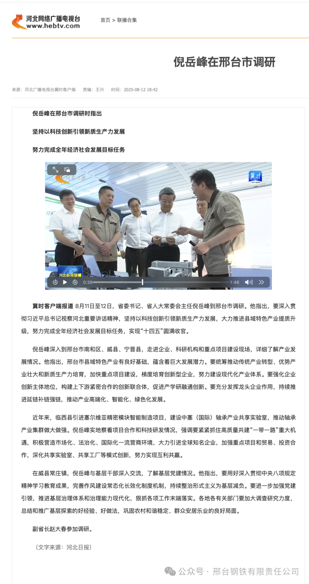 冀時(shí)客戶端報(bào)道 8月11日至12日,省委書(shū)記、省人大常委會(huì)主任倪岳峰到邢臺(tái)市調(diào)研。他指出,要深入貫徹習(xí)近平總書(shū)記視察河北重要講話精神,堅(jiān)持以科技創(chuàng)新引領(lǐng)新質(zhì)生產(chǎn)力發(fā)展,大力推進(jìn)縣域特色產(chǎn)業(yè)提質(zhì)升級(jí),努力完成全年經(jīng)濟(jì)社會(huì)發(fā)展目標(biāo)任務(wù),實(shí)現(xiàn)“十四五”圓滿收官。